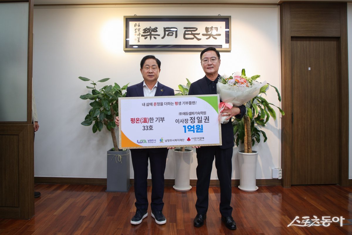 남양주시(시장 주광덕)는 2일, ㈜에듀셀파기숙학원(이사장 정일권)이 남양주시복지재단 고액기부 프로그램 ‘평온(溫)한 기부’에 1억 원을 약정하며 나눔 실천에 동참했다고 밝혔다.