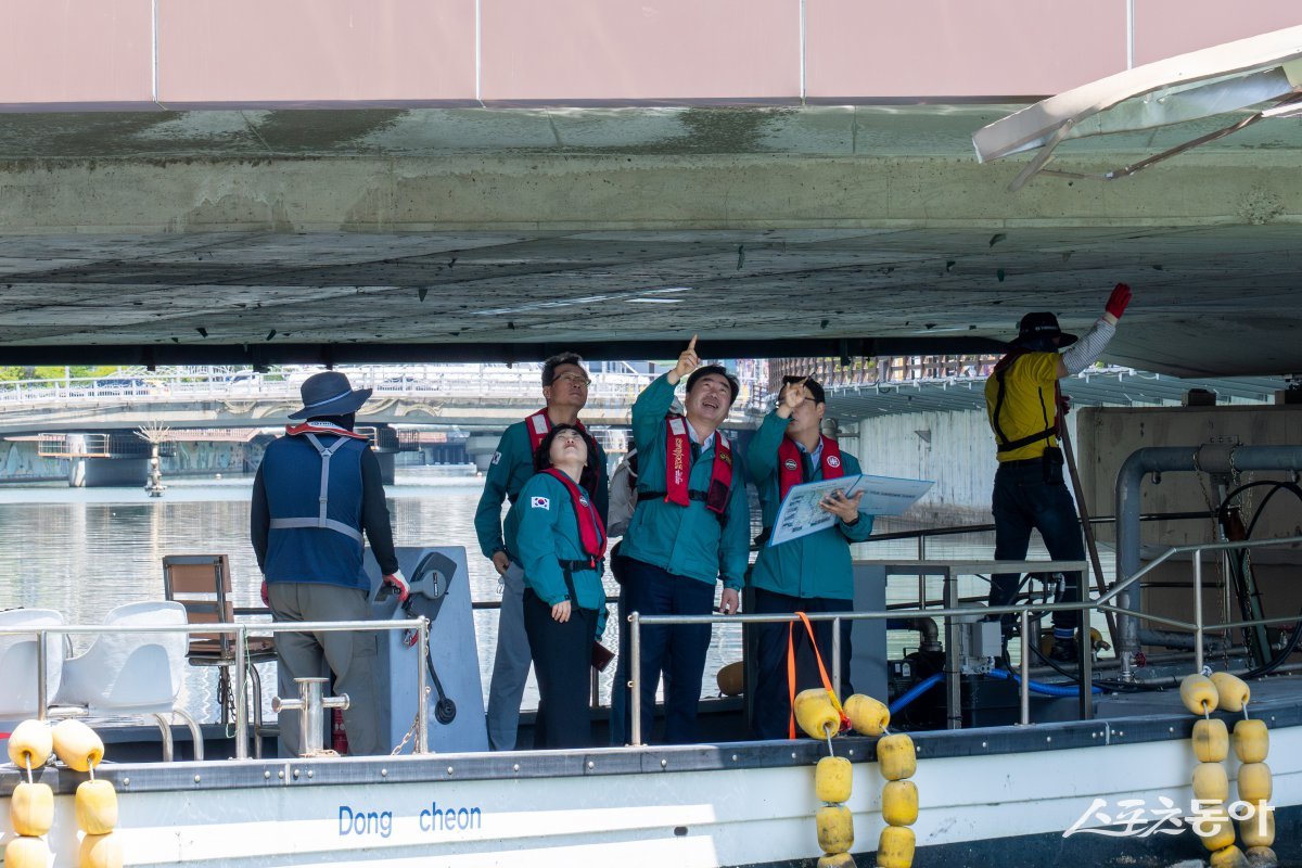 드론과 선박을 활용, 동천 교량 구조물 꼼꼼하게 확인