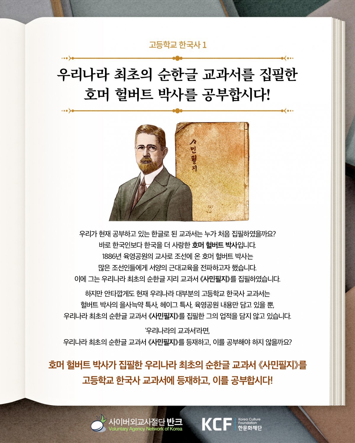 사이버외교사절단 반크와 한문화재단은 우리나라 최초의 순한글 교과서 ‘사민필지’를 집필한 호머 헐버트 박사의 업적을 교과서에 등재하는 캠페인을 전개한다.