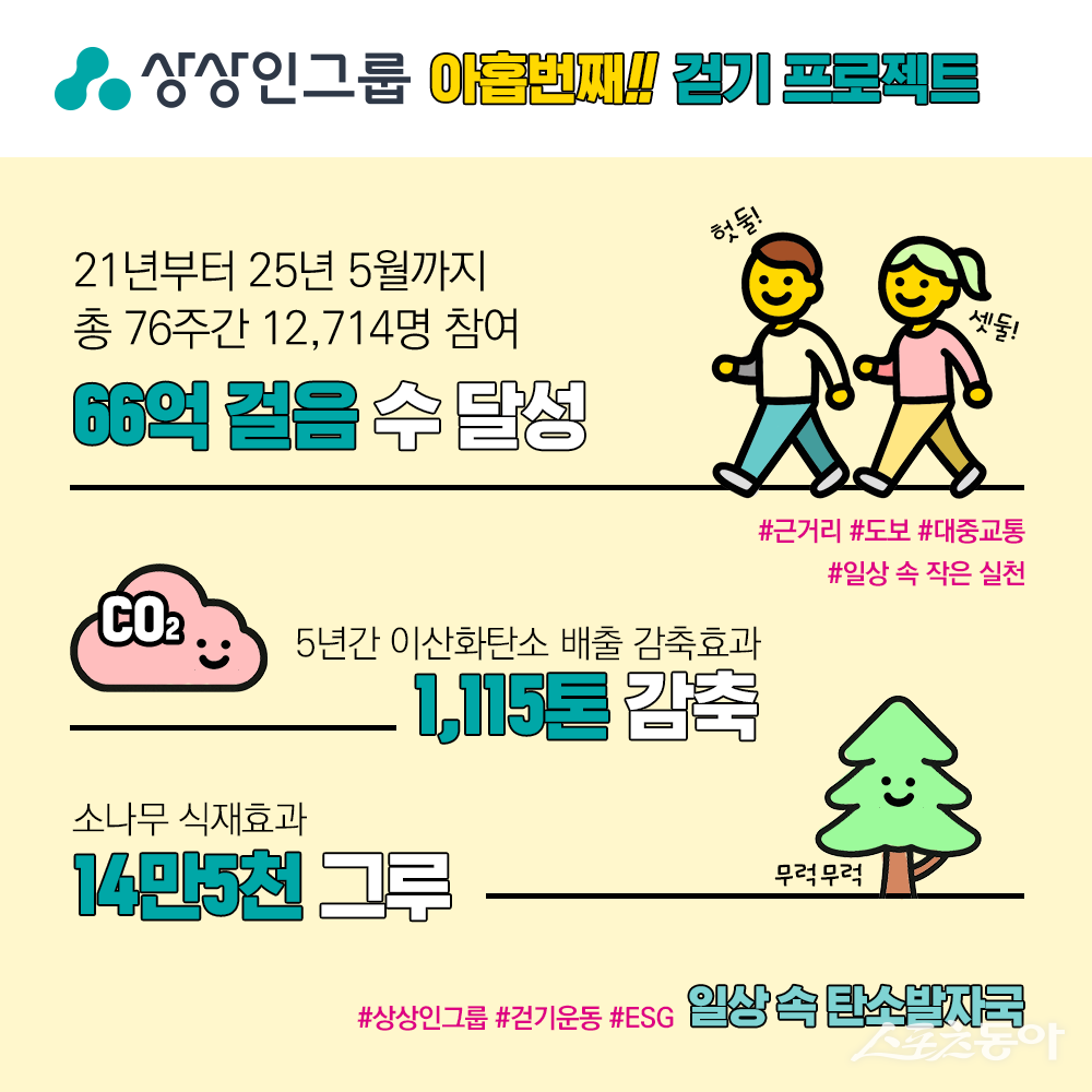유준원 상상인 대표는 “걷기 프로젝트를 통해 우리가 일상에서 실천하는 작은 변화가 얼마나 큰 환경적 가치를 창출할 수 있는지 다시금 확인하는 계기가 됐다”며 “향후 지속 가능한 미래를 위해 임직원 모두가 함께 실천할 수 있는 ESG 활동을 이어갈 것”이라고 했다.