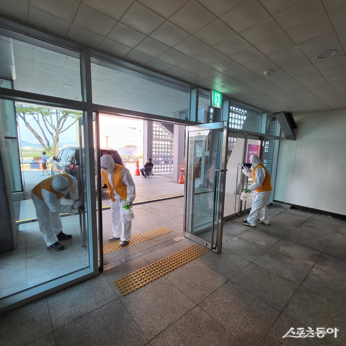 구미시 방역단이 구미시민운동장 입구를 방역하고 있는 광경. 사진제공ㅣ구미시