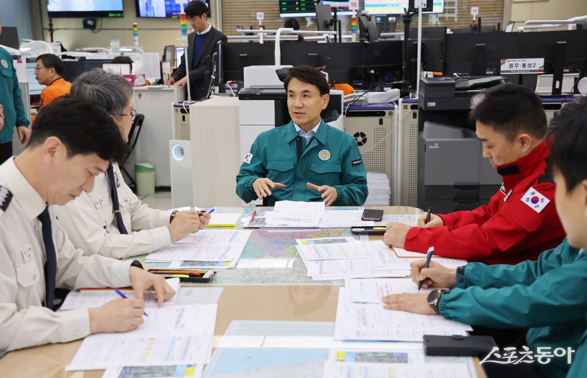 강원특별자치도(도지사 김진태)가 행정안전부 주관 ‘2025년 재난관리평가’에서 우수기관으로 선정되며, 민선 8기 출범 이후 3년 연속 우수기관의 성과를 이어갔다(김진태 지사 회의 모습). 사진제공|강원도