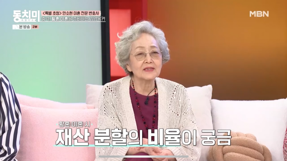 이날 함께 출연한 이혼 전문 안소현 변호사는 “혼인 기간이 길수록 서로의 기여도가 비슷해 보여서 보통 5대 5로 나오는 경우가 많다”고 설명했다. 이에 김영옥은 “5대 5도 억울하다. 2대 8로 해달라. 남편이 2, 내가 8”이라고 주장해 현장을 웃음바다로 만들었다.
