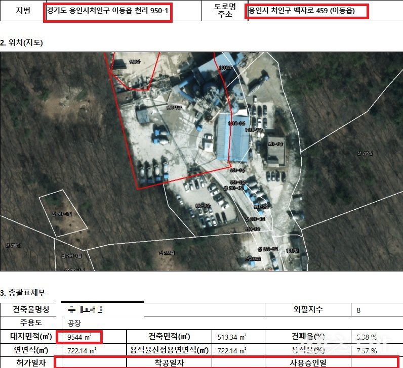 경기도 용인시 처인구 이동읍 천리 950-1번지 일대 건축물 대장. 사진제공|경기도