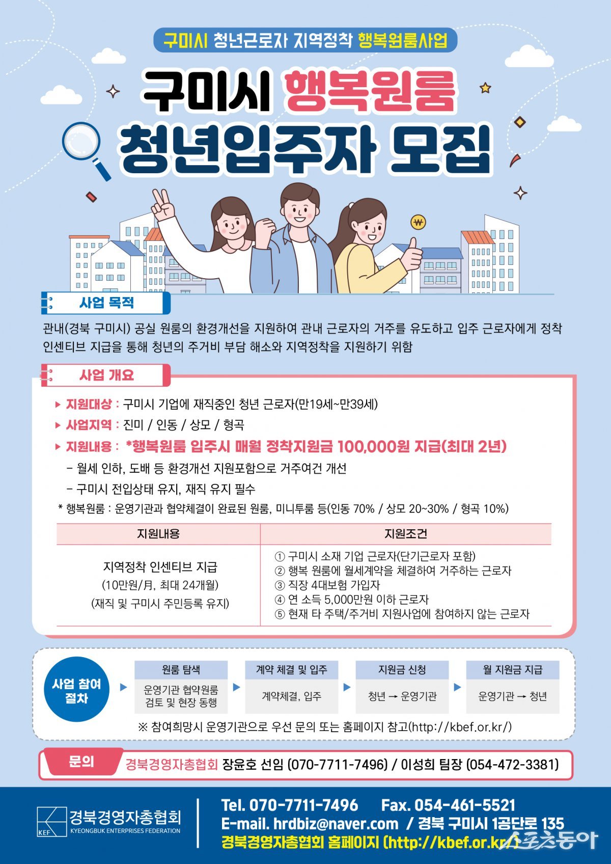 지원 대상은 관내 기업 청년 근로자 100명으로, 무주택자이면서 연소득 5000만원 이하를 기준으로 한다. 구미시 관외에 거주하는 청년을 1순위로 선발할 예정이며, 참여 청년은 협약된 공실 원룸에 입주하고 구미시 내로 주소를 이전해야 한다. 선정 시 월 10만원씩 최대 24개월 간 총 240만원의 주거비가 지원된다.
