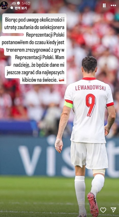 로베르트 레반도프스키는 9일(한국시간) 소셜미디어(SNS)를 통해 “폴란드 대표팀 감독에 대한 신뢰를 잃었다. 이를 고려해 현 감독이 재임 중인 한 대표팀에서 물러나기로 결정했다”며 “세계 최고의 팬들과 다시 함께하길 바란다”고 밝혔다. 사진출처|레반도프스키 인스타그램 캡처