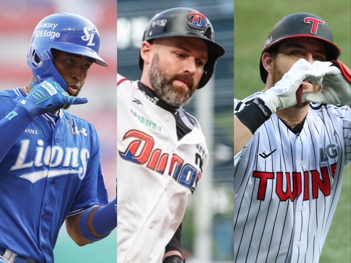 지난해 홈런왕 NC 맷 데이비슨(가운데)이 6월 들어 거포 능력을 되찾아 삼성 르윈 디아즈(왼쪽)와 LG 오스틴 딘이 앞서가고 있는 홈런 레이스에 본격 뛰어들었다. 이들의 경쟁은 지금부터가 진짜다. 사진제공|삼성 라이온즈·NC 다이노스·LG 트윈스