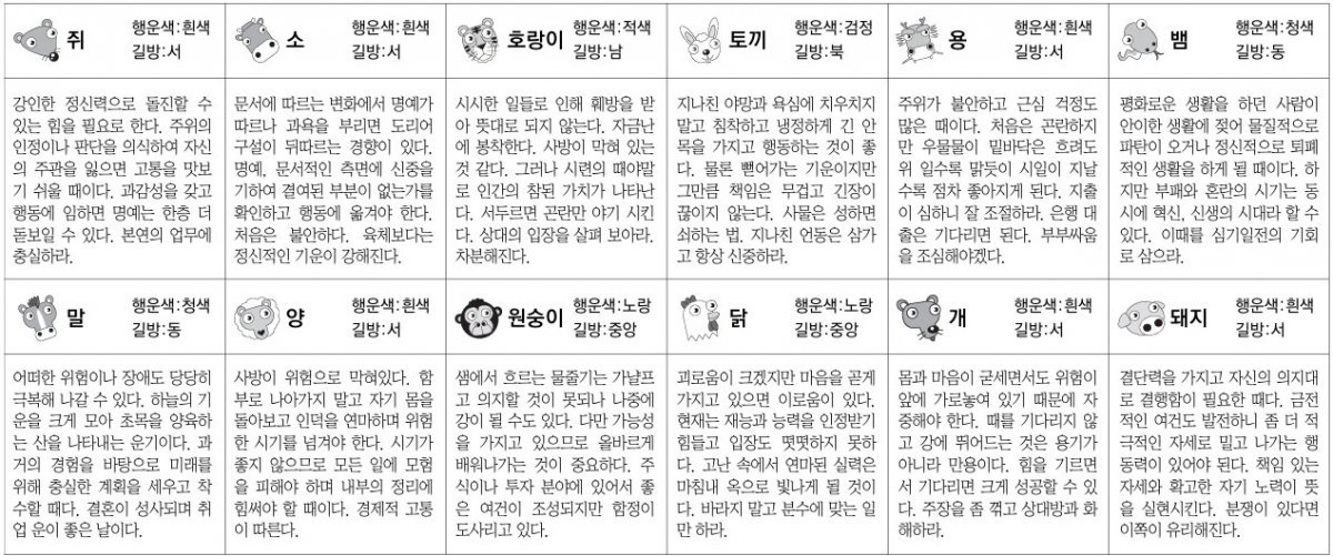 쥐띠 : 강인한정신력으로돌진할수있는힘을필요로한다.주위의인정이나판단을의식하여자신의주관을잃으면고통을맛보기쉬울때이다.과감성을갖고행동에임하면명예는한층더돋보일수있다.본연의업무에충실하라.