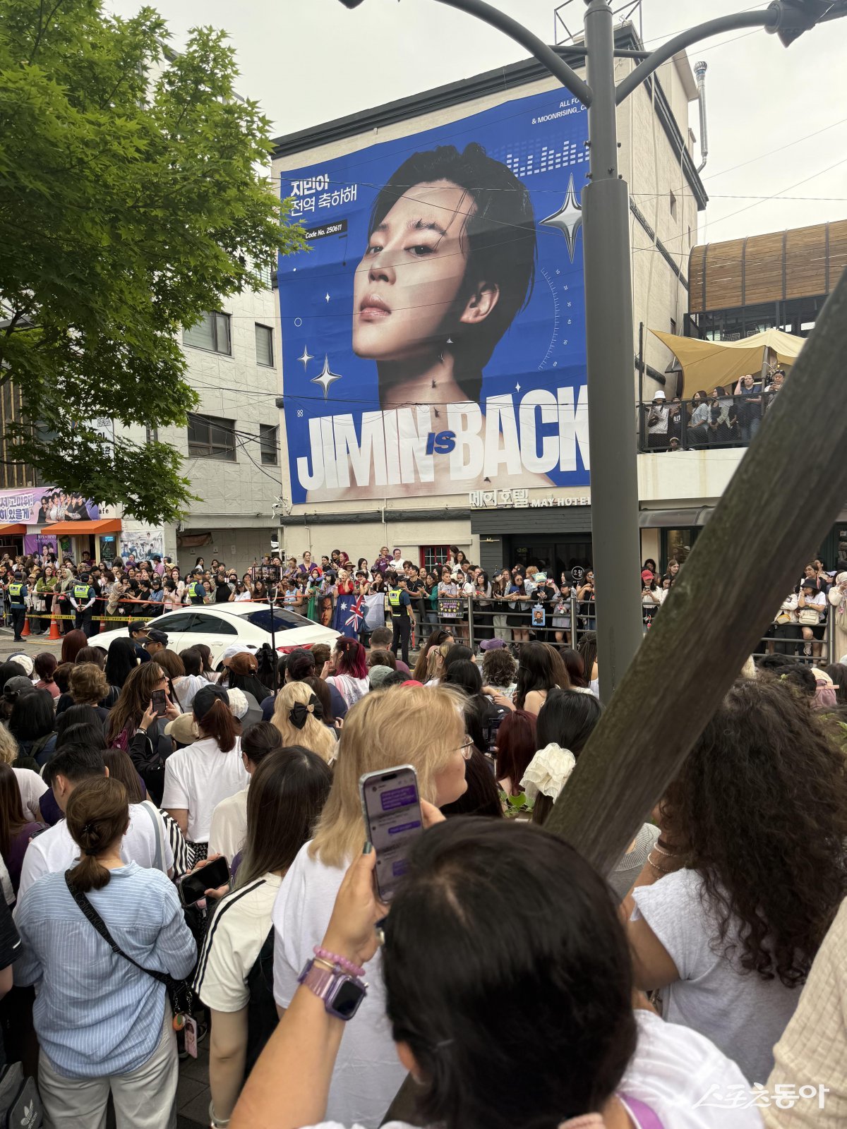 이날 RM과 뷔에 이어 11일 지민과 정국까지 멤버들 대다수가 전역하는 이번 주 ‘아미’를 중심으로 축제 분위기가 최고조에 달한 가운데, 용산 하이브 사옥 주변은 저마다 국기를 든 1500여(경찰 추산) 팬들이 구름 떼처럼 에워싸는 진풍경이 벌어졌다.