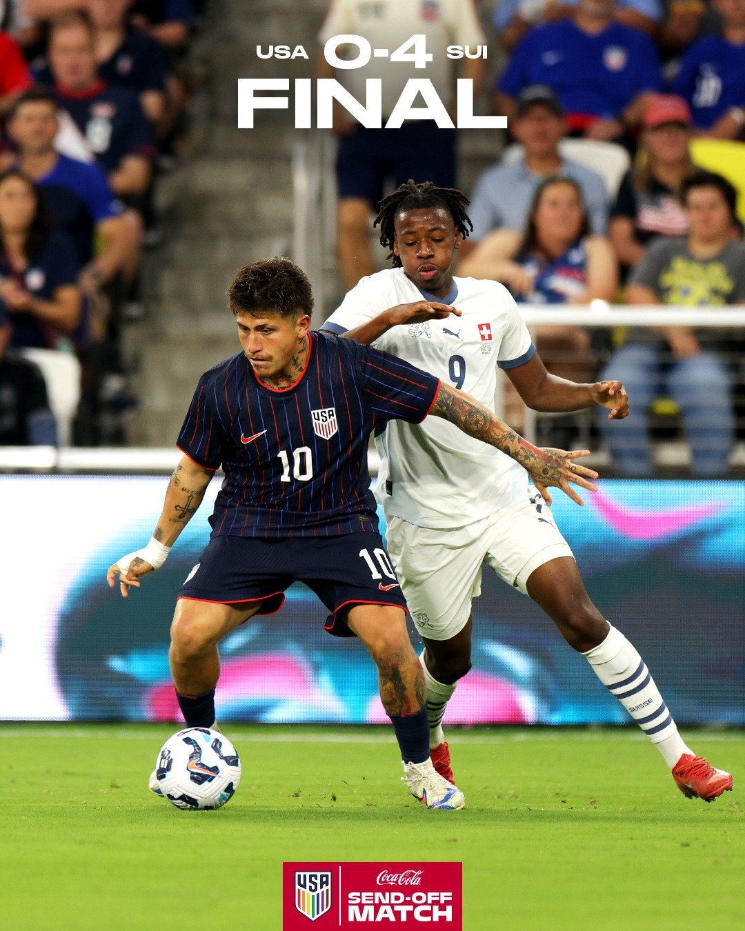 마우리시오 포체티노 감독이 지휘하는 미국은 11일(한국시간) 조디스파크에서 열린 스위스와 홈 평가전에서 0-4 완패를 당했다. 이로써 3월 파나마와 북중미카리브해축구연맹(CONCACAF) 네이션스리그 준결승(0-1 패), 캐나다와 3·4위 결정전(1-2 패), 이달 8일 튀르키예전(1-2 패)에 이어 또다시 패배를 떠안았다.