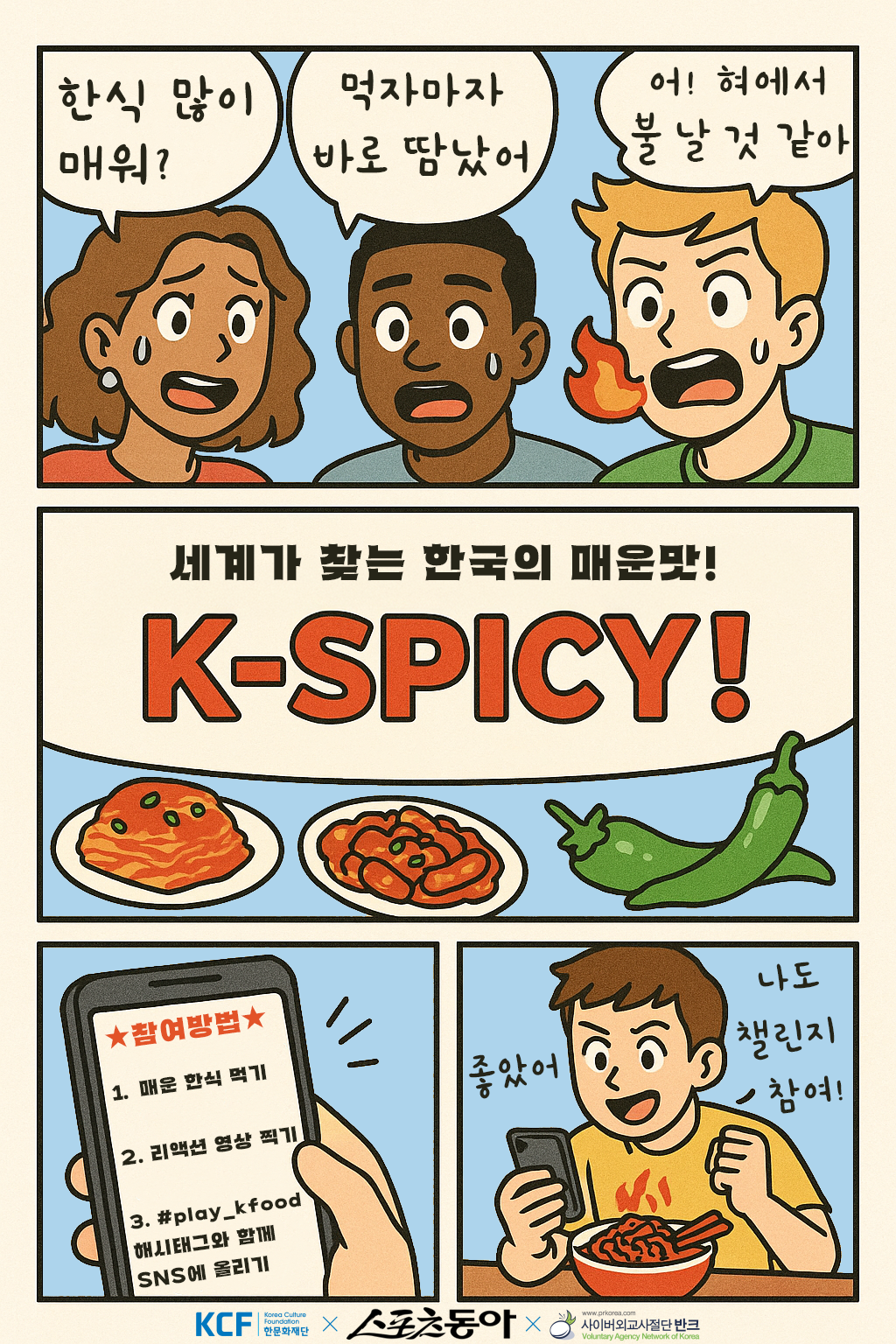 기존에 직접 그린 인스타툰으로 세계어 한국을 알리는 반크 청소년, 청년들의 글로벌 한국홍보대사 활동이나 한국 홍보물을 소개하기도 했는데, 이번에 처음으로 AI를 활용한 인스타툰으로 챌린지 안내를 시도했다. 인스타툰은 인스타그램에서 볼 수 있는 짧은 만화 형태로, ‘PLAY K-FOOD 월드컵’ 챌린지 중 일반인 참여 부분인 K-SPICY 챌린지에 집중했다. 세계인이 찾는 한식을 시작으로, 김치와 떡볶이 그리고 청양고추 등을 보여주며 한국의 매운 음식에 집중하고 마지막으로는 챌린지 방법을 설명했다. 챌린지 참여 방법은 매운 한식을 먹고 리액션을 촬영해 #play_kfood 해시태그와 함께 SNS에 올리면 된다.