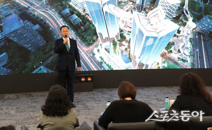 정희민 포스코이앤씨 사장이 지난 10일 서울 용산 정비창 전면1구역 재개발정비사업 홍보관을 찾아 조합원들과 소통하고 있다. 사진제공ㅣ포스코이앤씨