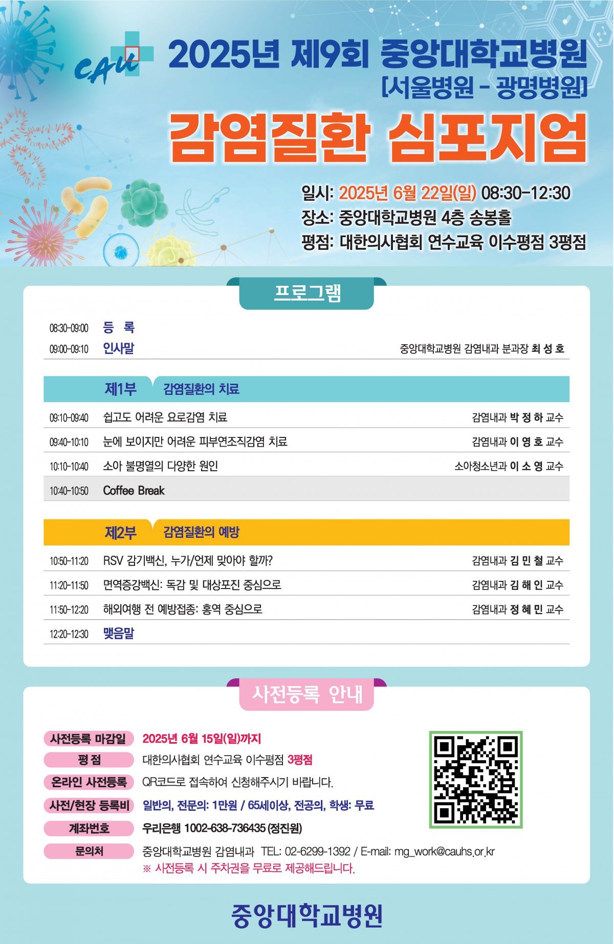 중앙대학교병원(병원장 권정택)은 22일 ‘제9회 감염질환 심포지엄’을 진행한다.