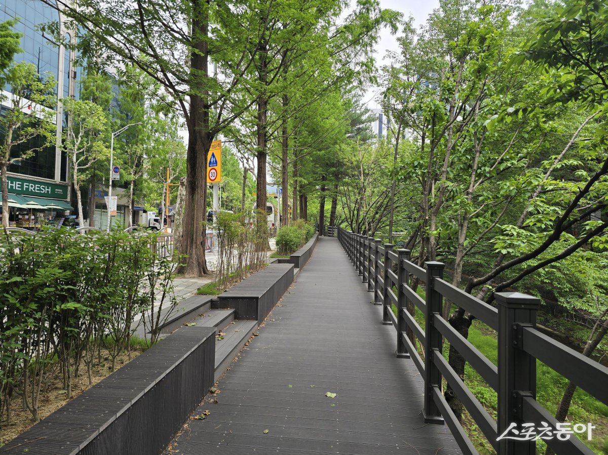 산책로 곳곳엔 앉음벽, 야탑1교 쪽엔 휴게 쉼터가 설치됐다. 이곳 산책로 조성은 야탑3동 주민의 숙원 해결 차원에서 추진됐다.