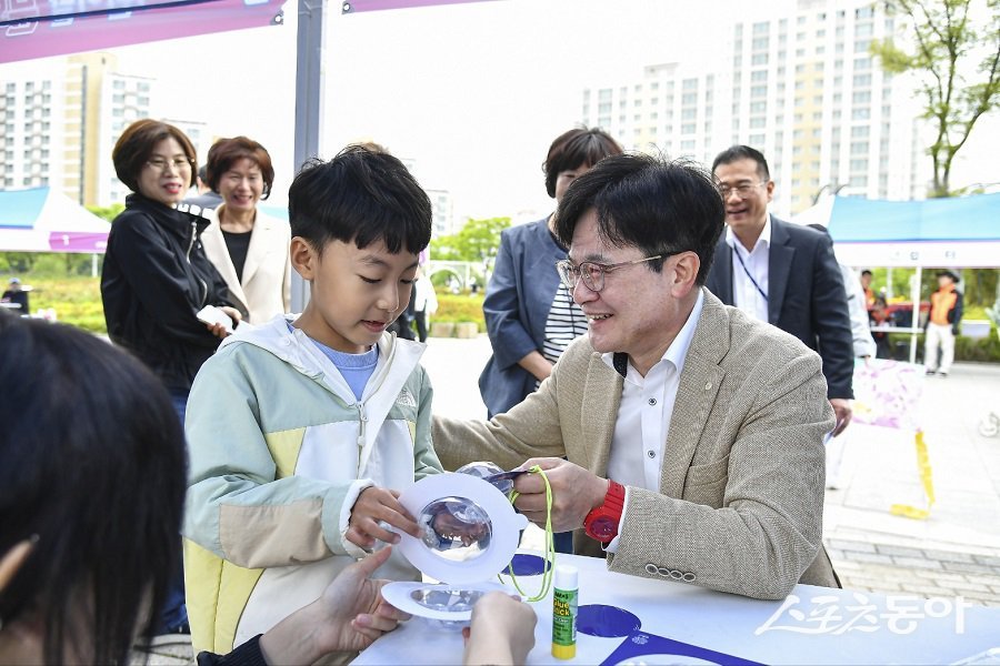 김포시, 출산친화적 가족사랑 동요대회에서 김병수 시장이 아이들을 격려하고 있다. 사진제공|김포시청