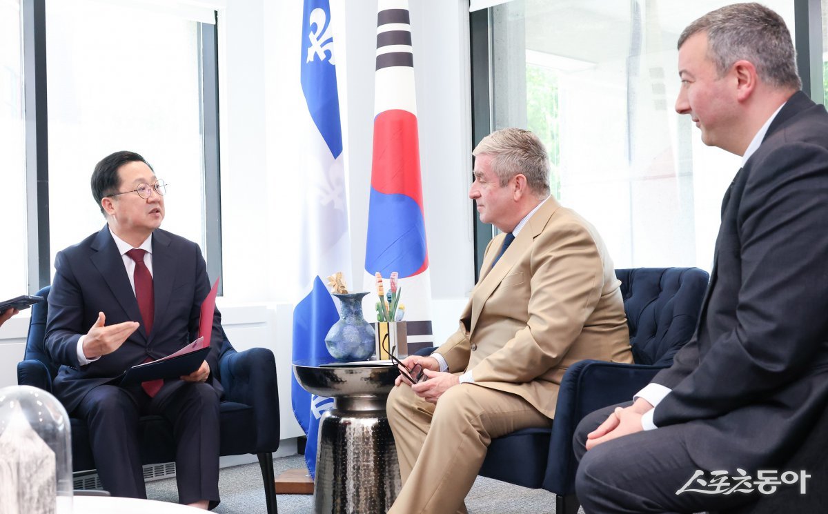 이장우 대전시장이 지난 13일(현지시각) 퀘벡주정부의 공식 초청을 받아 퀘벡시를 방문, 세계경제과학도시연합 가입 의향서를 전달받으며 대전과 퀘벡 간 글로벌 협력 관계가 한층 강화될 전망이다(이장우 대전시장과 퀘백 알랭 상스 카르티에 대외관계부 차관). 사진제공|대전시