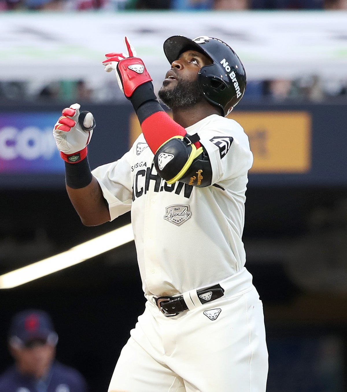 SSG 외국인타자 기예르모 에레디아가 15일 인천SSG랜더스필드에서 열린 롯데와 홈경기 6회말 결승포를 터트린 뒤 세리머니를 펼치고 있다. SSG는 에레디아의 활약에 힘입어 롯데를 1-0으로 꺾고 3연패를 탈출했다. 사진제공|SSG 랜더스