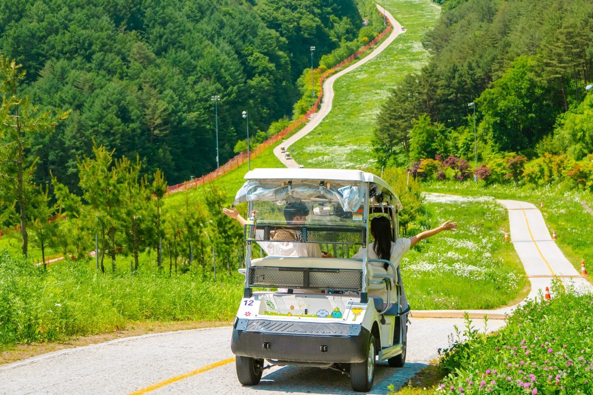 친환경 카트를 타고 하이원리조트 슬로프의 꽃길을 도는 카트투어 사진제공|강원랜드