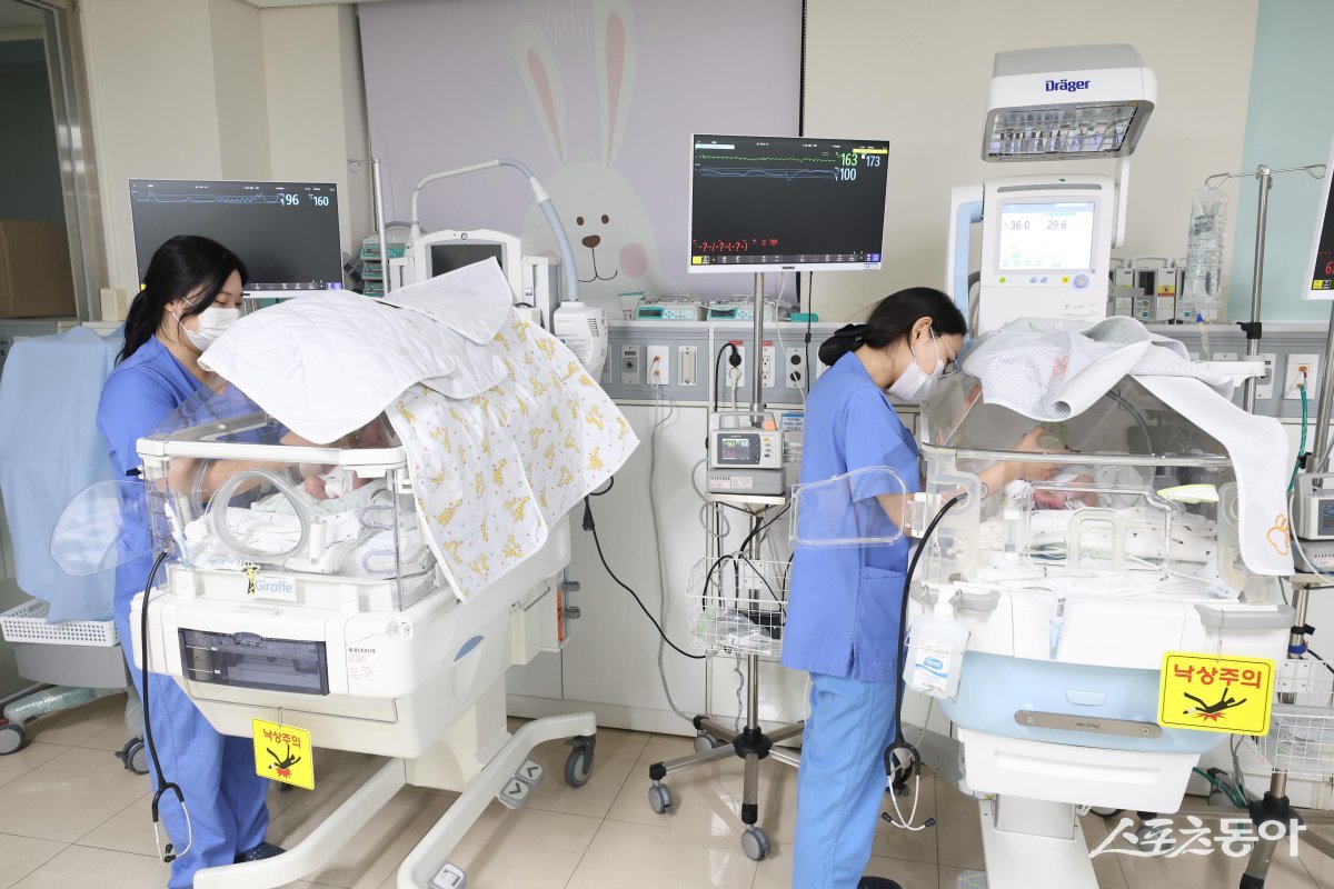 구미플러스 신생아 집중 치료센터에서 간호사들이 신생아를 돌보고 있다. 사진제공ㅣ구미시