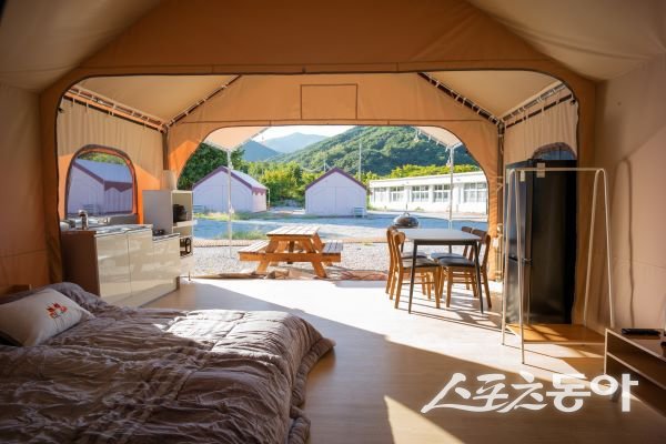 시설은 총 12개의 글램핑동 외에도 기존 폐교 건물을 리모델링한 관리동(사무실 및 매점), 중앙광장, 야외 쉼터, 주차장 등으로 구성돼 있다. 특히 여름 성수기에는 야외 수영장도 함께 운영될 예정이어서 가족 단위 방문객들에게 큰 인기를 끌 것으로 기대된다.