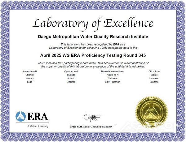 대구광역시 상수도사업본부 수질연구소가 세계적인 수질 분석 역량을 다시 한 번 입증했다.대구시는 수질연구소가 미국환경자원협회(ERA, Environment Resource Associates)가 주관하는 2025년 국제숙련도 시험에서 전 항목 ‘만족’ 판정을 받아 6년 연속 ‘최우수 분석기관’(Laboratory of Excellence)으로 선정됐다고 16일 밝혔다.