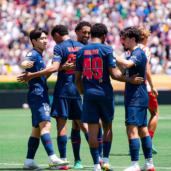 이강인(왼쪽 끝)이 16일(한국시간) 미국 캘리포니아주 로즈볼 스타디움에서 벌어진 아틀레티코 마드리드(스페인)와 클럽월드컵 조별리그 B조 1차전에서 4-0 완승을 거둔 뒤 동료들과 기뻐하고 있다. 그는 3-0으로 앞선 후반 추가시간 PK 골을 넣으며 대회 첫 득점을 신고했다. 사진출처│파리 생제르맹 소셜미디어