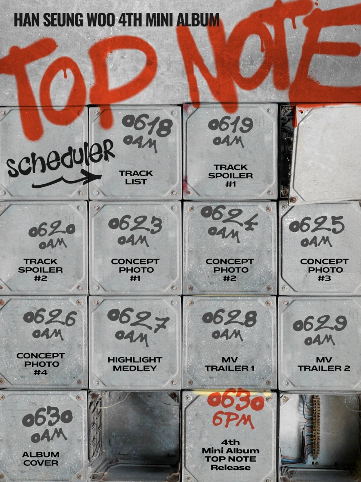 이미지에는 칸칸이 정리된 알루미늄 단자 박스 위에 프로모션 스케줄이 적혀 있고, 거친 질감의 스프레이 글씨로 새겨진 앨범명 ‘TOP NOTE’가 시선을 끌며 인상적인 분위기를 자아냈다.
