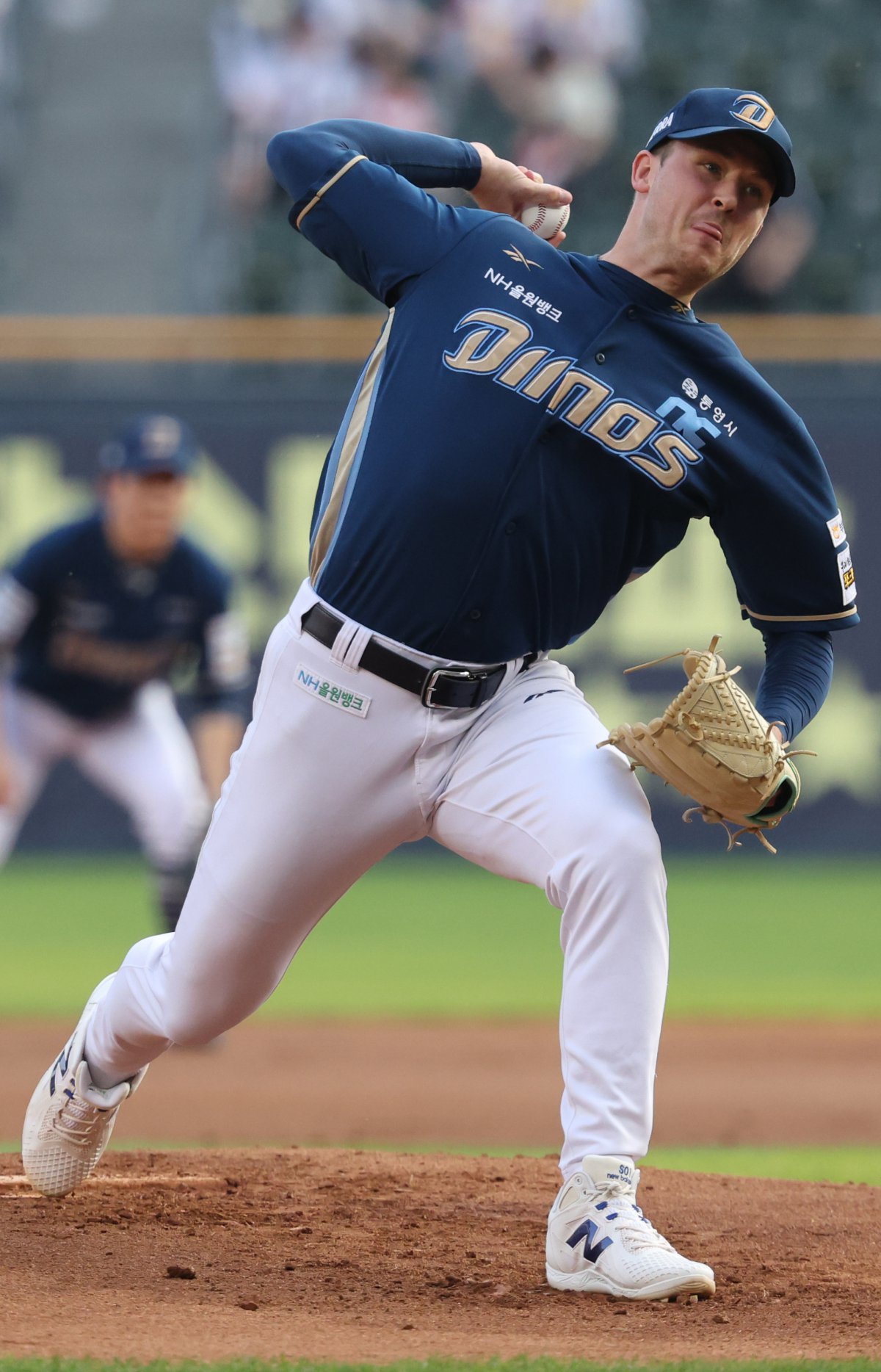 NC 라일리 톰슨이 17일 잠실구장에서 열린 2025 KBO리그 LG전에 선발등판해 힘차게 공을 던지고 있다. 라일리는 6이닝 2실점 호투로 팀의 6-2 승리를 이끌었다. 시즌 9승을 거둔 라일리는 한화 코디 폰세, 라이언 와이스와 함께 리그 다승 공동 선두에 올랐다. 잠실|뉴시스