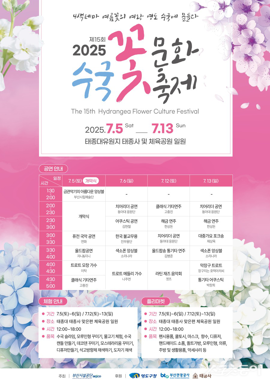 이성림 공단 이사장은 “태종대의 수국은 오랜 시간 시민과 관광객의 사랑을 받아온 소중한 자연유산”이라며 “올해 축제를 통해 더 많은 분들이 태종대를 찾아 여름의 정취를 느끼며 편안한 시간을 보내시길 바란다”고 전했다.