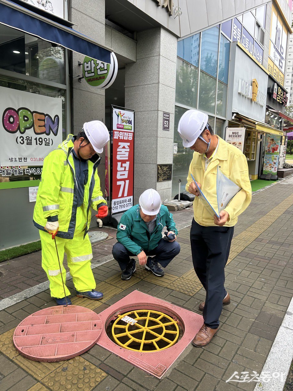 박승삼 부시장은 도로변 하수시설을 직접 살피며 맨홀 뚜껑 고정 상태, 추락방지망 설치 여부, 빗물받이의 토사 및 쓰레기 적치 상태, 우수 흐름 저해 요소 등을 면밀하게 점검했다.