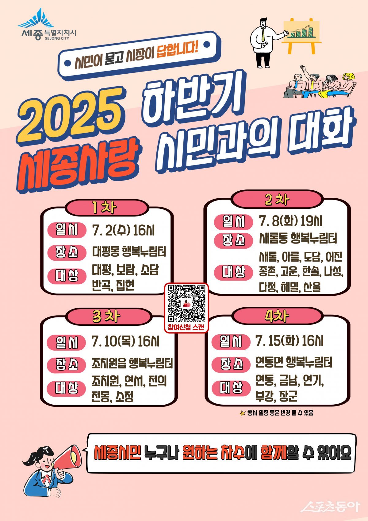 동 지역에서는 7월 2일 오후 4시 대평동 행복누림터, 7월 8일 오후 7시 새롬동 행정누림터에서 시장과 시민의 만남이 예정돼 있다. 읍면 지역 주민과의 대화는 7월 10일 오후 4시 조치원읍 행복누림터, 7월 15일 오후 4시 연동면 행복누림터에서 개최된다.