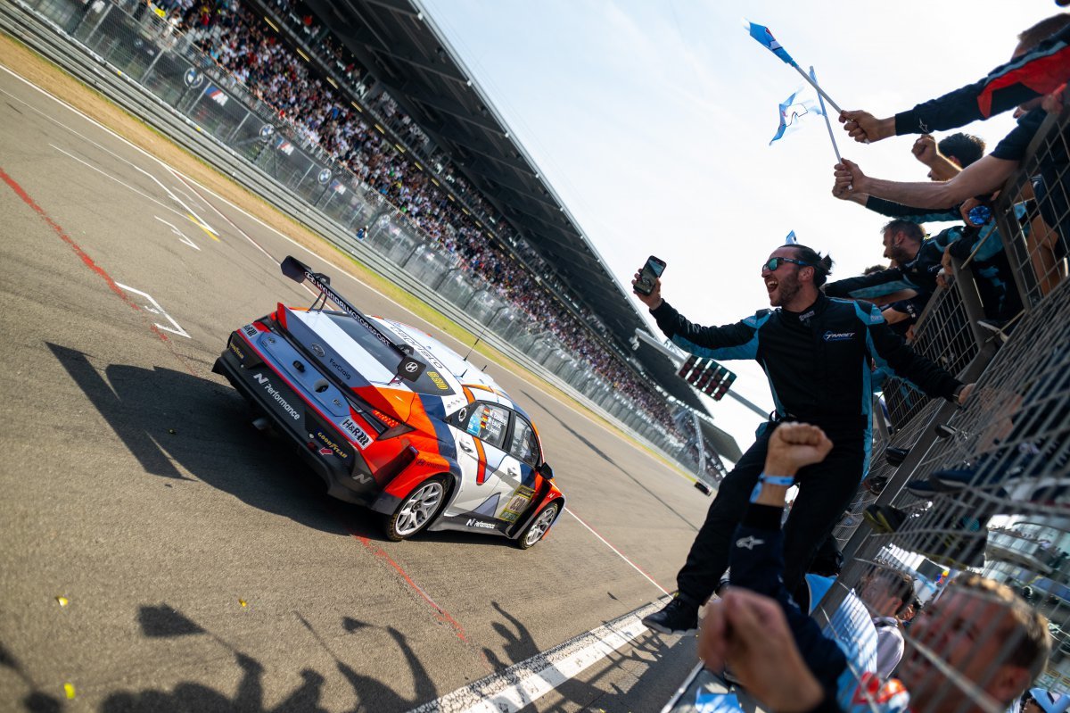 TCR 클래스에서 현대 N 유럽팀이 주행한 아반떼 N TCR 830번 차량이 축하를 받으며 결승전을 통과하는 모습. 사진제공 |현대차