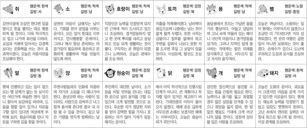 소띠 : 공연히마음이급해지는날이다.기회를얻어공업을이루는운이다.모든일이뜻대로이루어지고만사형통할운세이다.그러나매사항상준비하는마음가짐이필요하며겸손하고온화하게생활하여적을만들지않도록하라.