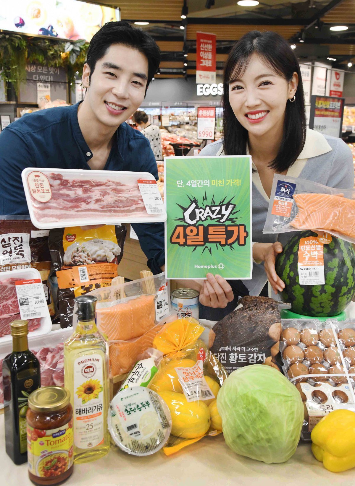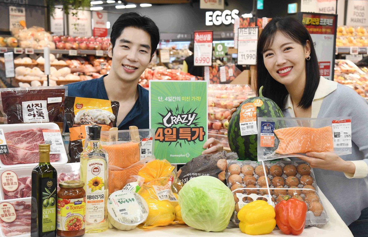 홈플러스가 29일까지 ‘크레이지 4일 특가’ 행사를 연다. 신선식품부터 쟁여두기 좋은 가공식품까지 인기 먹거리를 파격 할인가에 판매한다. 사진제공|홈플러스