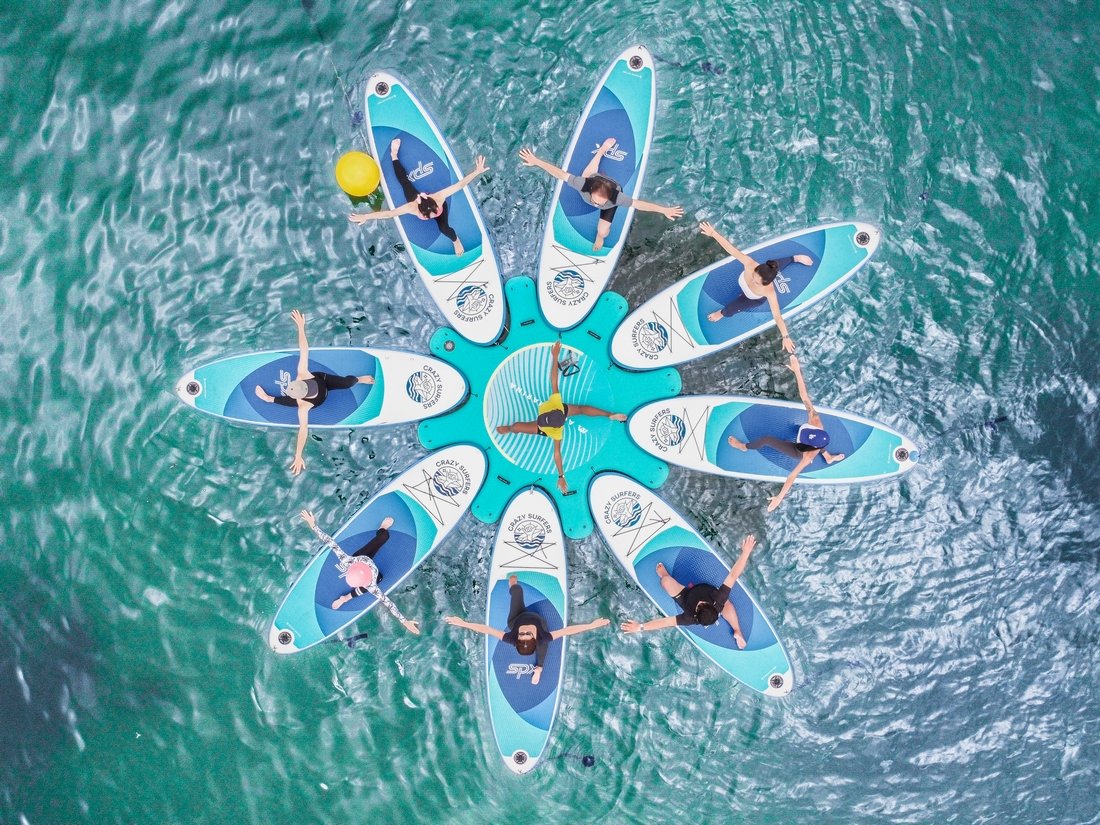 부산 광안리 해변에서 진행하는 SUP 요가. 패들보드 SUP과 요가를 접목한 힐링 프로그램이다 사진제공 |크레이지서퍼스