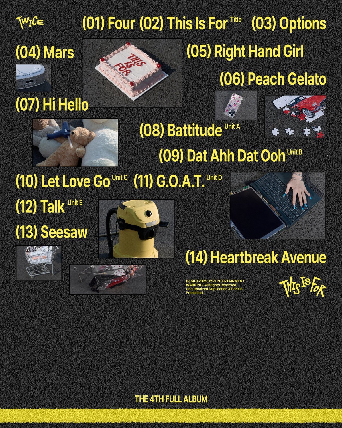 트와이스는 7월 11일 네 번째 정규 앨범 ‘THIS IS FOR’를 발매한다. 이에 앞서 JYP엔터테인먼트는 6월 26일 0시 트와이스 공식 SNS 채널에 트랙리스트 이미지와 함께 신보에 실리는 전곡 곡명을 공개했다.