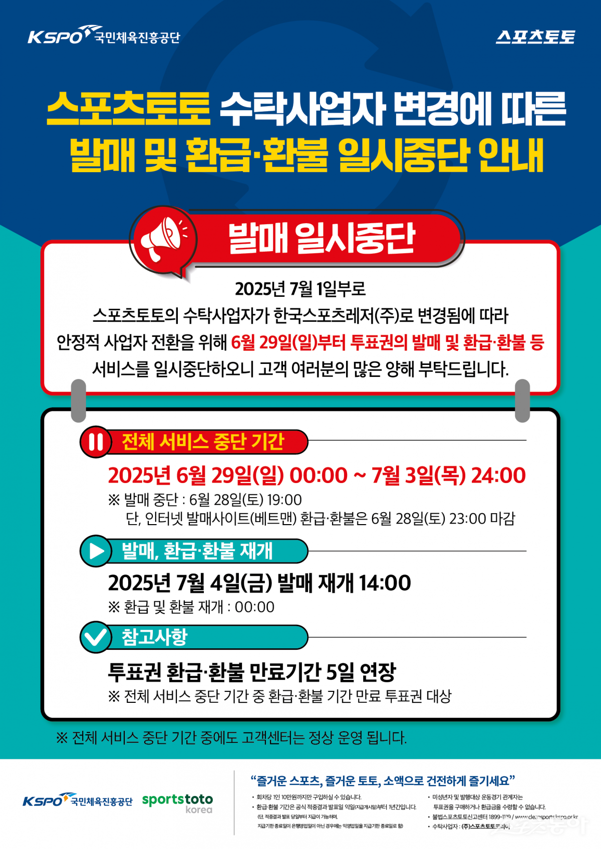 국민체육진흥공단이 발행하는 체육진흥투표권 스포츠토토가 기존 수탁사업자인 ㈜스포츠토토코리아의 계약 종료와 신규 수탁사업자인 한국스포츠레저㈜의 사업 개시에 따라, 2025년 6월 29일(일) 00시부터 7월 3일(목) 24시까지 5일간 스포츠토토 전 게임의 발매가 일시 중단된다.