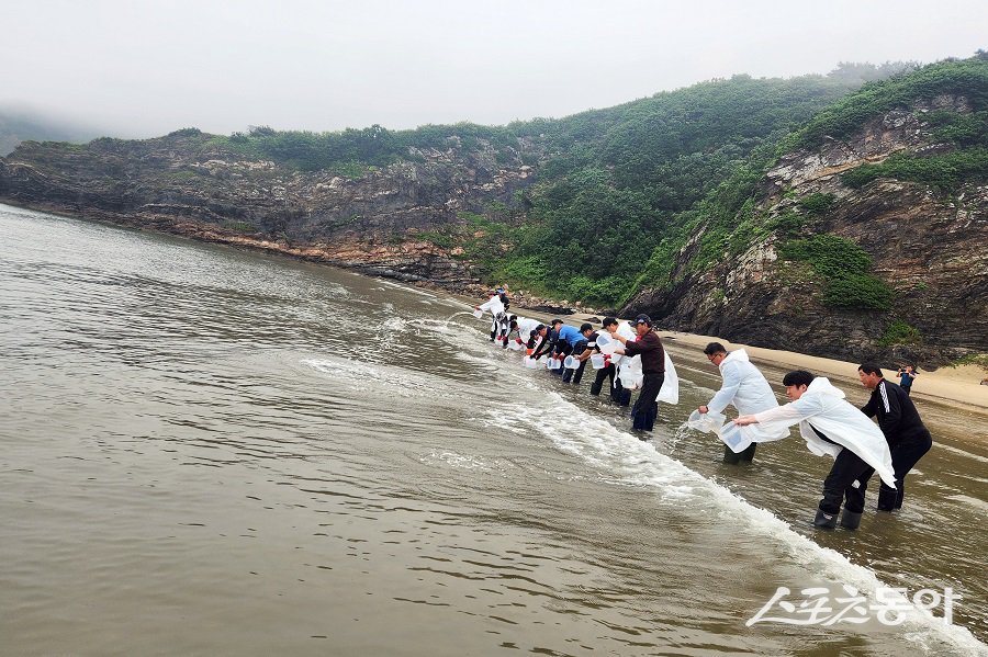 옹진군 수산종자연구소, 대청도 지두리 해변에 어린 꽃게 30만미를 방류하고 있다. 사진제공|옹진군청