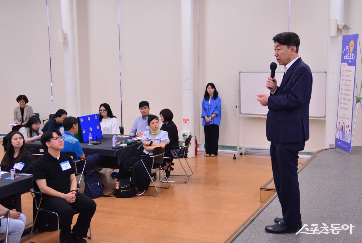 우범기 전주시장이 지난 25일 전주시자원봉사센터 1층 이웃사촌방에서 열린 ‘제6회 한바탕전주 시민대토론회’를 주재하고 있다. 사진제공=전주시