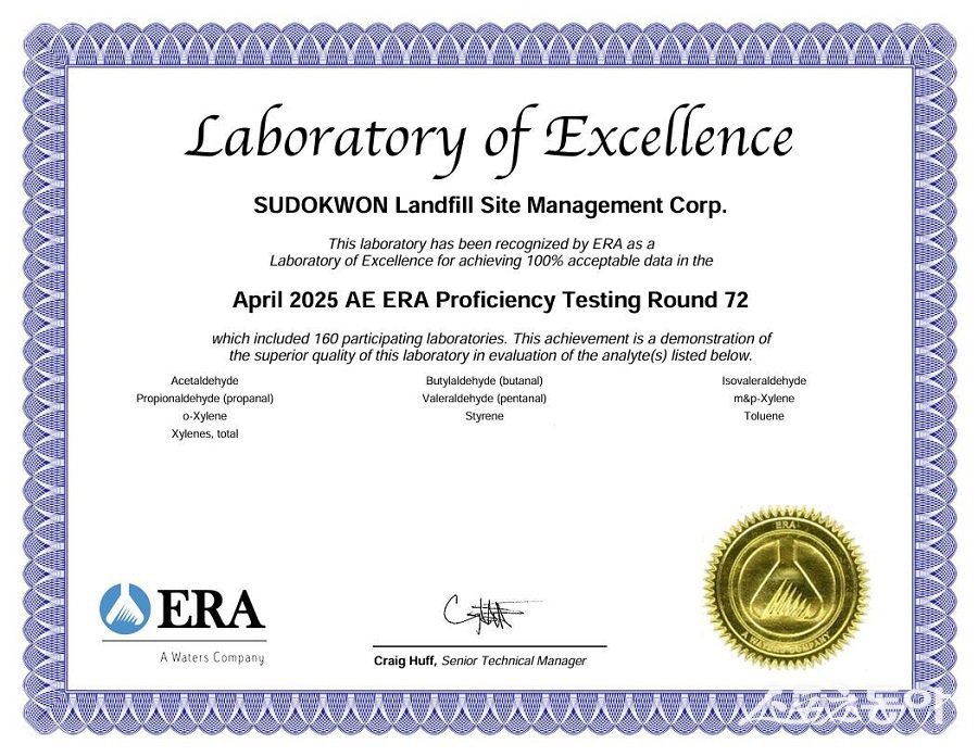 수도권매립지관리공사는 미국 환경자원협회(Environmental Resource Associates, 이하 ERA)가 주관한 2025년 국제숙련도 평가에서 최고 등급인 ‘Laboratory of Excellence’를 획득하는 쾌거를 얻었다.
