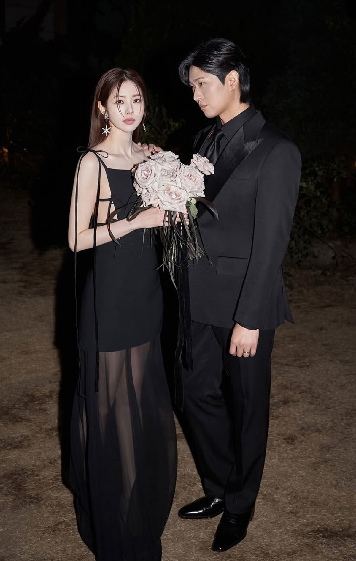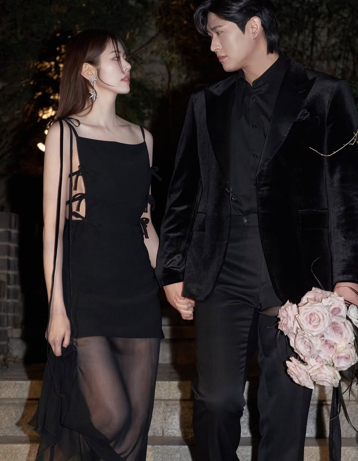 사진 속 두 사람은 환한 미소와 함께 자연스러운 스킨십으로 보는 이들의 시선을 사로잡았다. 끈으로만 묶은 파격적인 드레스와 수트를 맞춰 입고 서로를 바라보는 모습에서는 깊은 애정이 묻어난다.