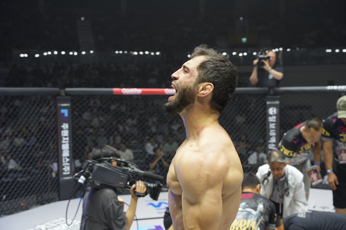 레슬링에 강점이 있는 마고메도프는 일어서지 못하던 오카에게 암 트라이앵글 초크를 구사하며 승기를 잡았다.