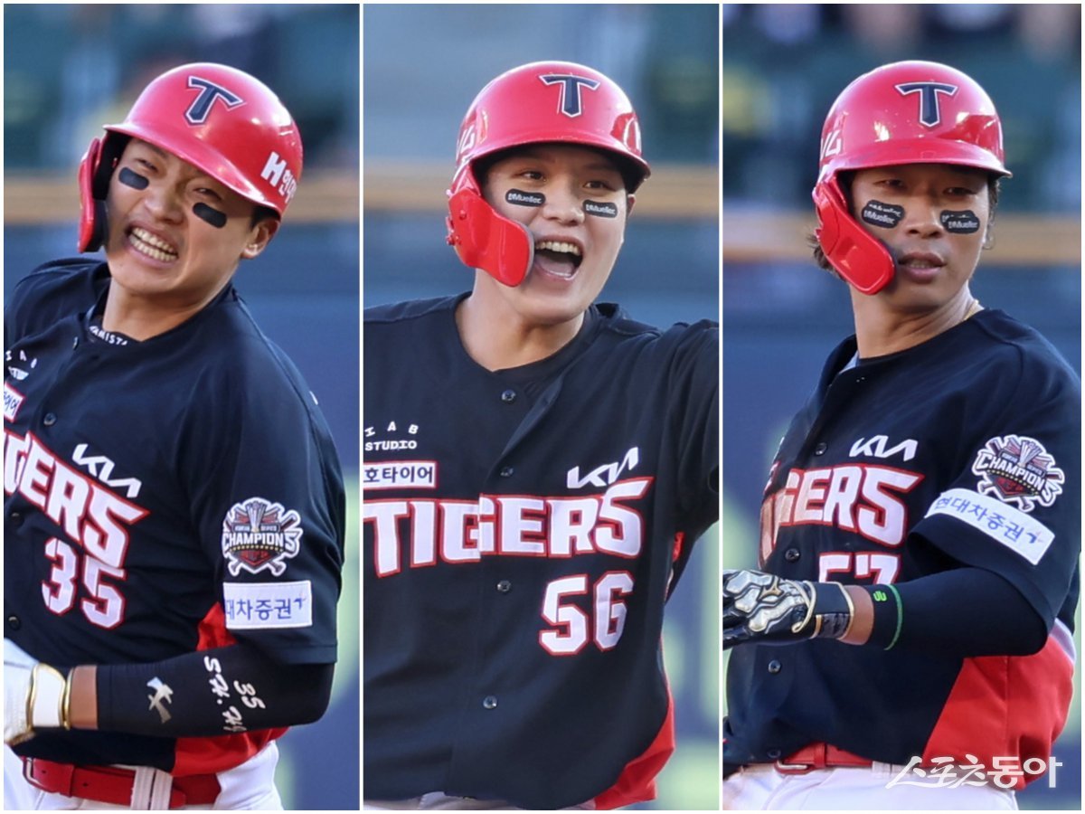 KIA 김석환, 오선우, 고종욱(왼쪽부터)이 29일 잠실구장에서 열린 LG와 원정경기에 출전해 팀의 12-2 승리에 힘을 보탰다. KIA는 이날 승리로 6월 월간 승률 1위를 확정했다. 사진제공|KIA 타이거즈