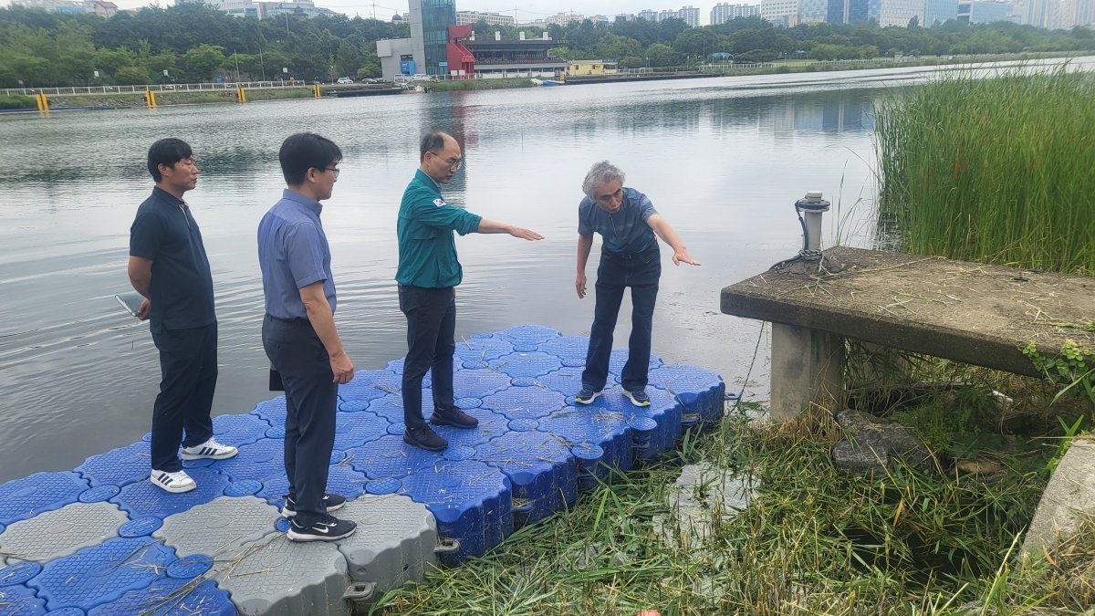 이성철 경륜경정총괄본부장(왼쪽부터 세 번째)을 비롯한 관계자들이 6월 26일 미사경정공원에서 풍수해를 대비해 안전 점검을 진행하고 있다. 사진제공 | 국민체육진흥공단