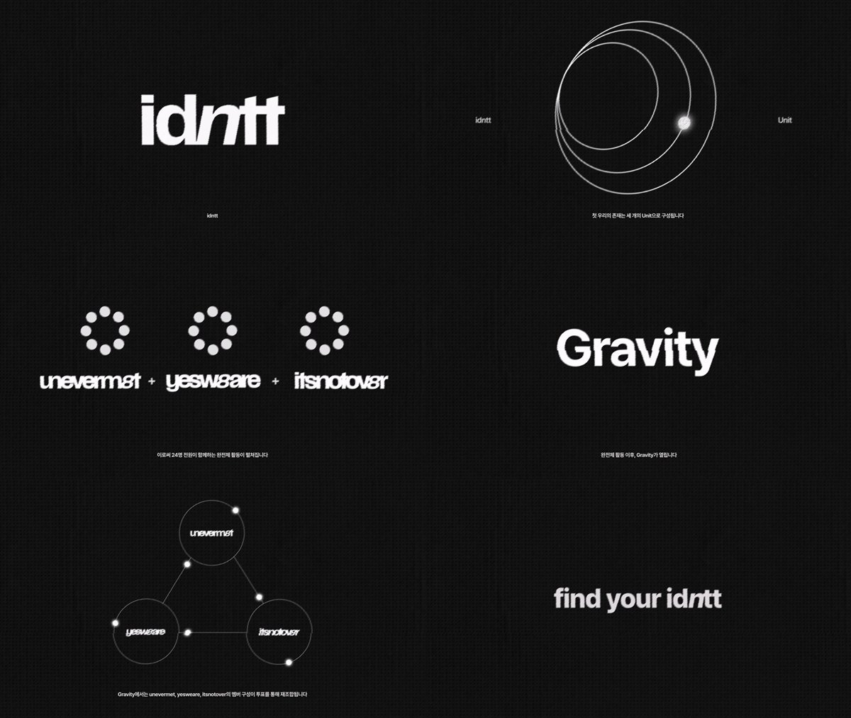 아이덴티티는 총 3개의 유닛으로 나뉜다. 첫 번째 유닛 unevermet은 ‘아이덴티티의 시작’이라는 서사를 품고 등장한 8인으로, 세상과 처음 마주한 소년들을 상징한다. 이어지는 yesweare는 또 다른 8인으로, 아이덴티티의 정체성을 더욱 선명하게 만든다. 이들은 앞서 공개된 unevermet과 함께 16명의 소년이 참여하는 새로운 곡을 선보일 예정이다.
