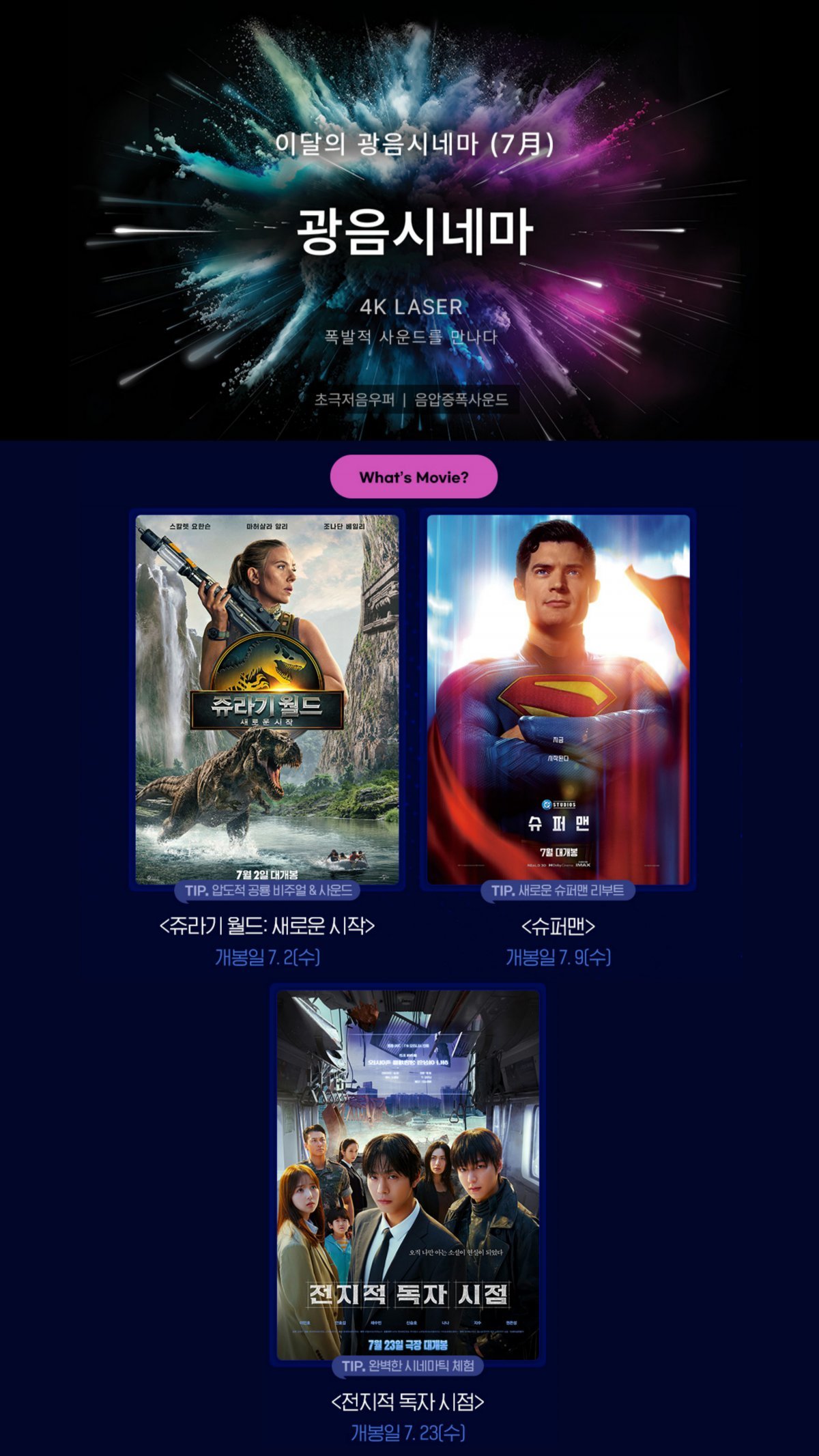 복합문화공간 컬처스퀘어를 지향하는 롯데시네마가 ‘쥬라기월드: 새로운 시작’, ‘슈퍼맨’, ‘전지적 독자시점’ 3편을 7월 사운드 특화관 ‘광음시네마’에서 상영한다.