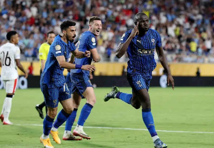 알힐랄 쿨리발리(오른쪽 끝)가 1일(한국시간) 미국 플로리다주 올랜도의 캠핑월드스타디움에서 벌어진 맨체스터시티와 클럽월드컵 16강전에서 2-2로 맞선 연장 전반 4분 역전 골을 터트린 뒤 기뻐하고 있다. 알힐랄은 맨시티를 4-3으로 꺾는 이변을 연출했다. 사진출처│클럽월드컵 홈페이지