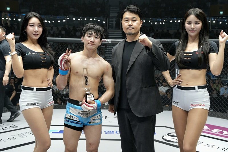 로드FC 서덕호 대표가 28일 서울 장충체육관에서 열린 ROAD FC 073 플라이급 매치에서 승리한 편예준에게 트로피를 시상한 뒤 기념촬영을 하고 있다. 사진제공ㅣ로드FC
