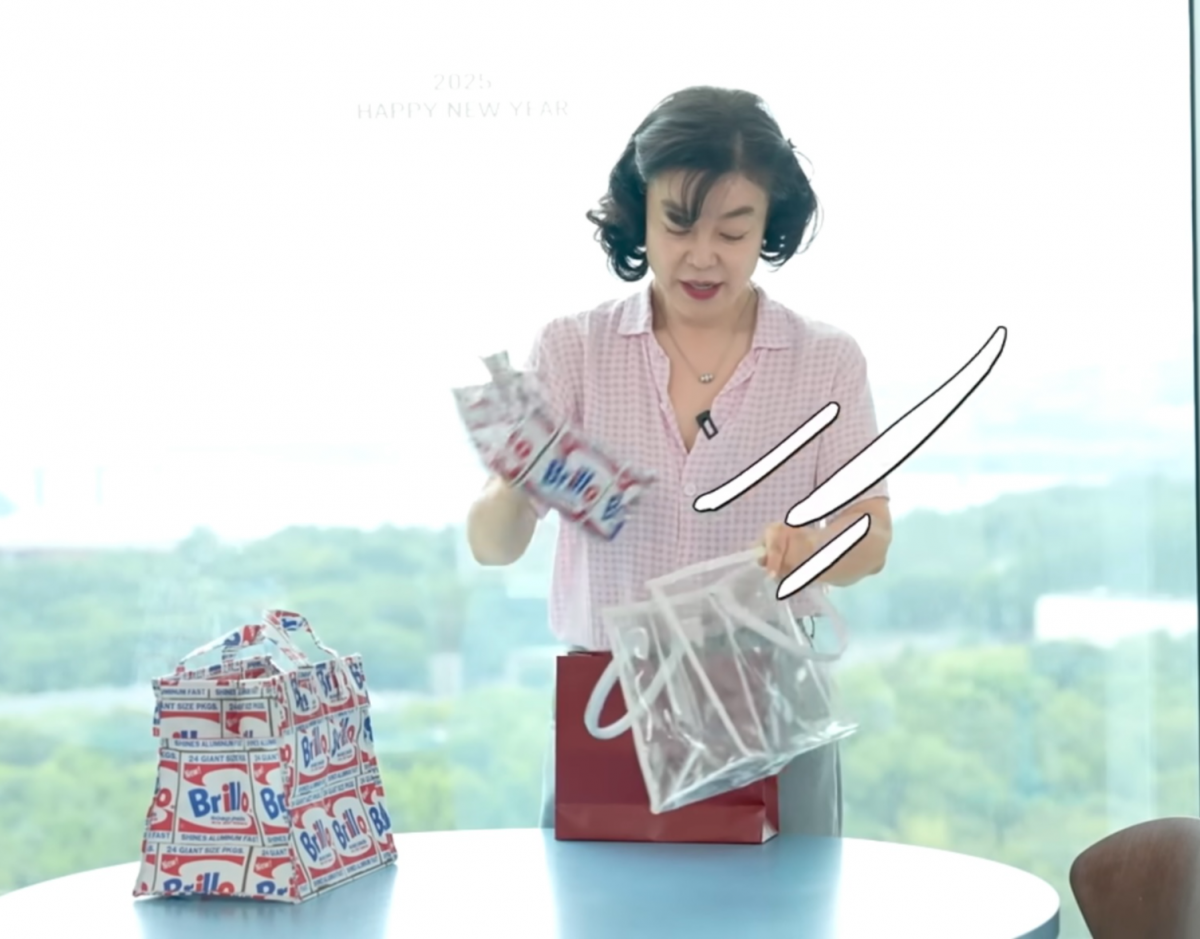 올여름 필수 액세서리로 꼽히는 투명 백. 최화정이 투명 백 안에 또 다른 가방을 넣어 다양한 매력을 알려주고 있는 모습. 사진출처 | 최화정 유튜브