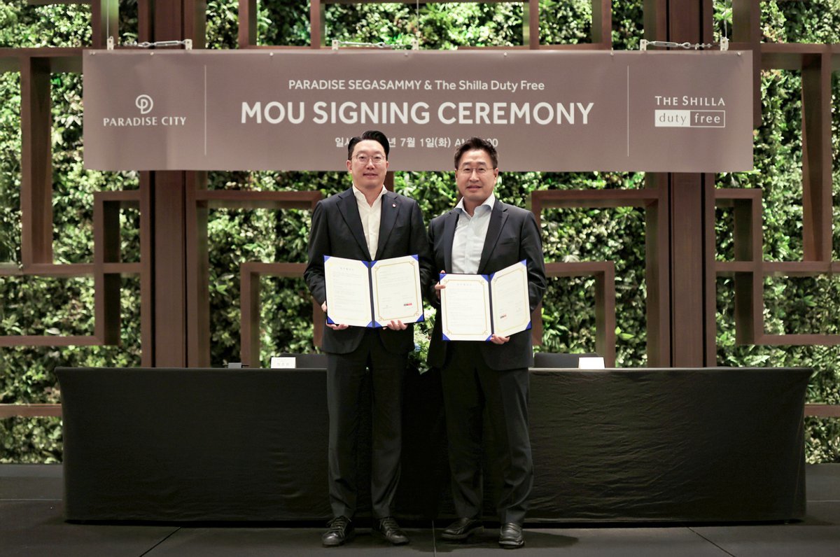 7월 1일 인천 영종도 파라다이스시티에서 열린 업무협약식에 참석한 최종환 파라다이스 대표이사(왼쪽)과 김준환 호텔신라 TR부문 부문장 사진제공 |파라다이스시티